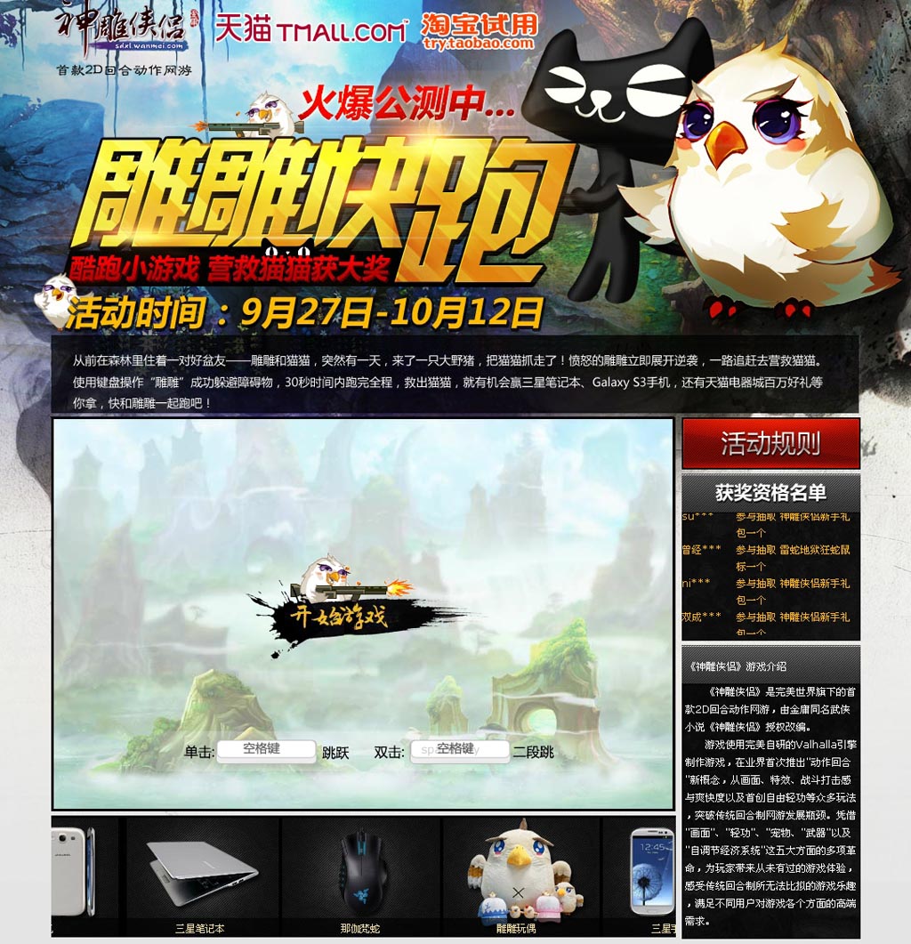 凭借五大独创玩法以及五大革新系统,完美世界旗下最受欢迎的2D回合制网游——《神雕侠侣》公测异常火爆,海量玩家涌入游戏体验不一样的回合游戏乐趣。近日《神雕侠侣》与淘宝试用中心、天猫电器城共同推出“雕雕快跑 营救猫猫获大奖”主题活动,用不到30秒的时间就能轻松赢得时尚数码好礼,这么赚的活动还犹豫什么。